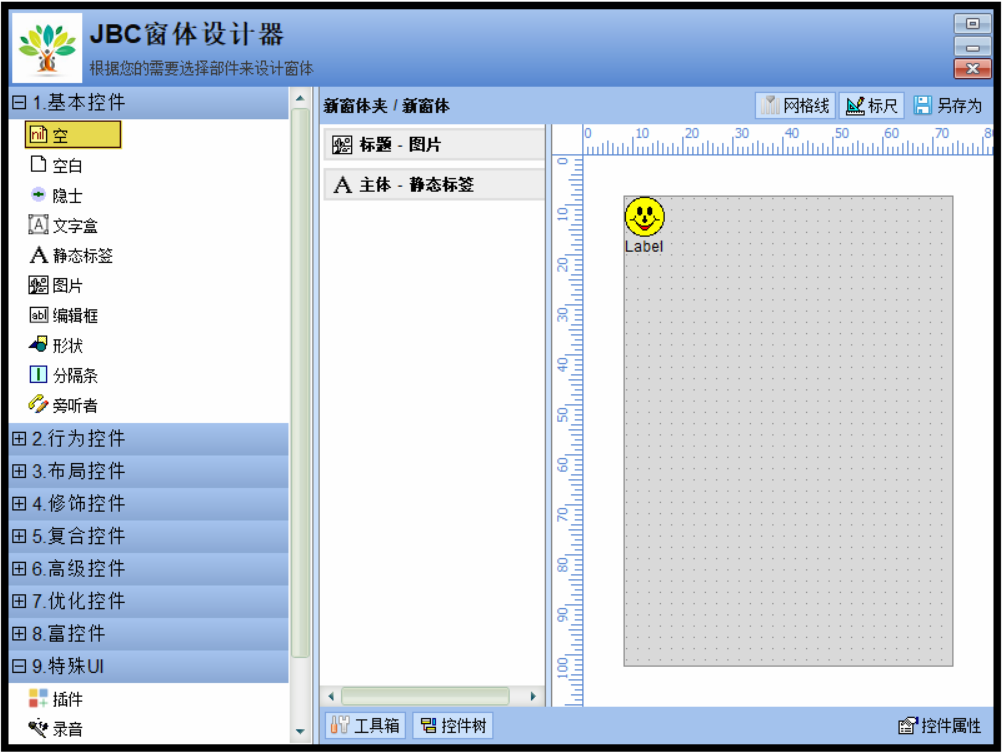 下图是工具箱、控件树和设计区,支持基本控件、行为控件和布局控件等